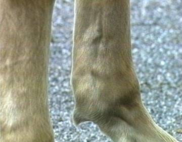Overvulling van de peesscheden te zien zijn als meer langwerpige zwellingen op de binnen- en buitenzijde achter boven de kogel.